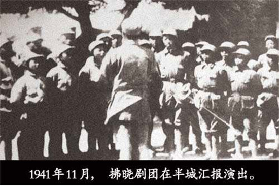 1938年深秋,劇團(tuán)到泌陽縣鄧莊鋪演出,群眾自動(dòng)地找木棍、找門板、挖土埋柱子,很快搭起一座戲臺,掛上幕布,點(diǎn)燃油燈,男女老少坐在戲臺前的空地上。戲臺上先是演員們合唱抗日歌曲《新四軍軍歌》《游擊隊(duì)歌》《到敵人后方去》等,后演出話劇《突擊》。當(dāng)劇中的老爺爺抱著被日寇殺死的孩子,含淚控訴敵人的暴行時(shí),臺下的觀眾禁不住地憤怒高呼:“打倒日本帝國主義!把日本鬼子趕出中國!”1939年11月初,徐海東隨劉少奇由竹溝到華中路過新興集,彭雪楓命拂曉劇團(tuán)組織一個(gè)晚會(huì),以示熱烈歡迎。拂曉劇團(tuán)接受任務(wù)后,大家爭分奪秒,只用了一天時(shí)間,就集體創(chuàng)作排練出京劇《徐海東粉碎日寇“掃蕩”》,第二天就在歡迎晚會(huì)上演出。