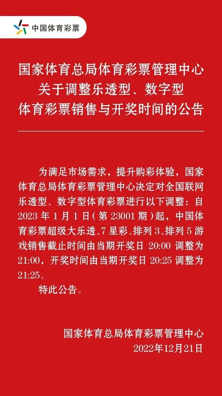 2023年1月1日(第23001期)起,體彩超級大樂透、7星彩、排列3、排列5游戲的銷售截止時間將延后至每晚21:00,開獎時間將延后至不同游戲相應(yīng)開獎日當晚21:25。體彩上述四款游戲止售、開獎延后一小時,將為購彩者帶來更加便利的購彩體驗。
