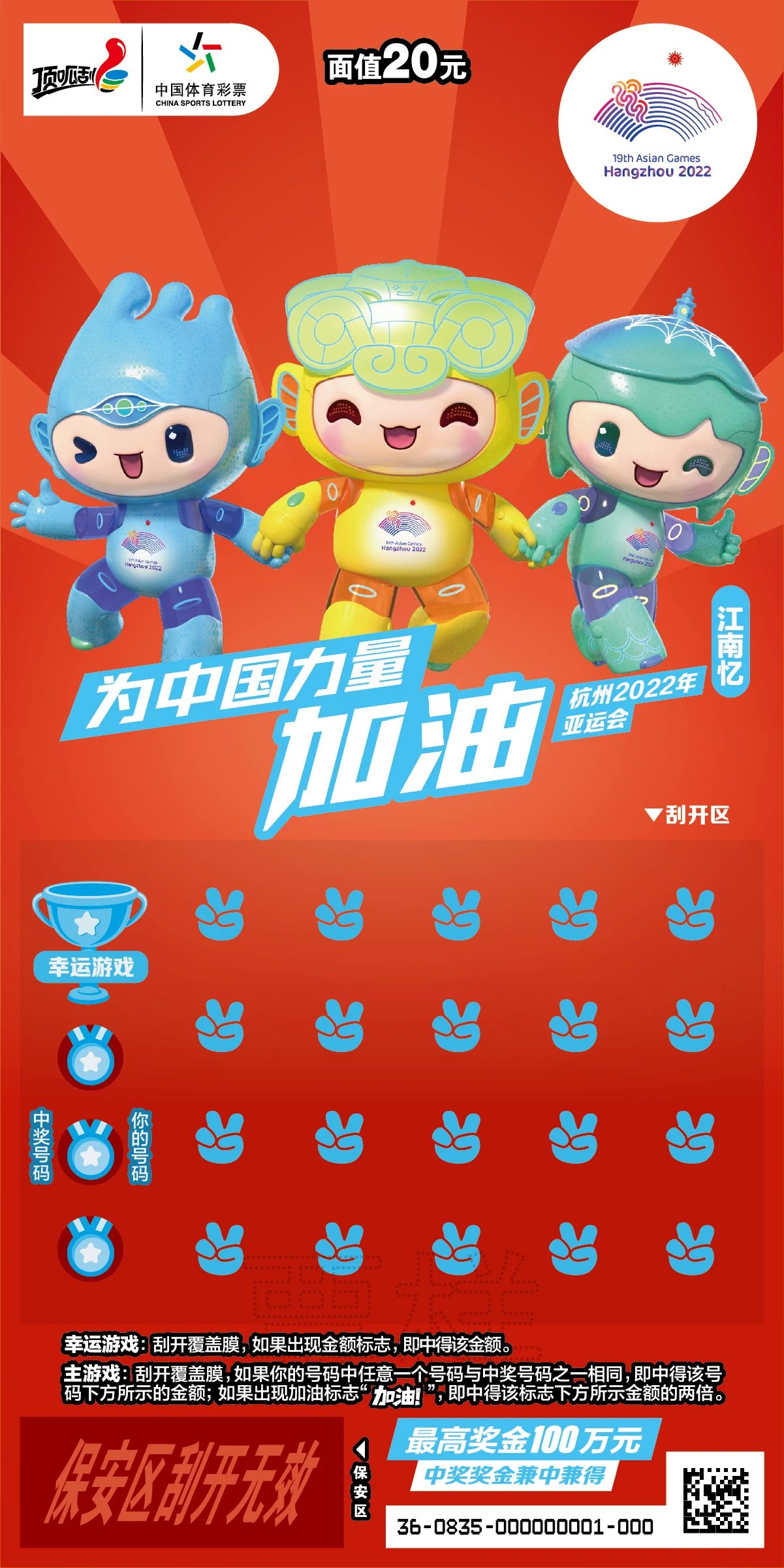 在杭州亞運(yùn)會開幕倒計時200天之際,浙江體彩推出“為中國力量加油”杭州亞運(yùn)會主題即開型體育彩票,票面以亞運(yùn)會吉祥物“琮琮”“蓮蓮”“宸宸”為主體形象,將具有親和力的吉祥物與充滿活力的網(wǎng)球、游泳、籃球、乒乓球等體育運(yùn)動相結(jié)合,以動感時尚形式展示亞運(yùn)會賽事項目。