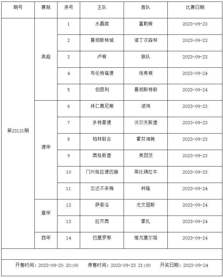 傳統(tǒng)足彩第23121期的賽事主要由英超、德甲、意甲和西甲組成。五大聯(lián)賽激戰(zhàn)正酣,豪門球隊都參加了周中的歐戰(zhàn),一周雙賽對于球隊體能有著不小的影響。其中曼城、曼聯(lián)、拜仁和巴薩等豪門都入選了本期足彩,他們能否全取三分我們一起來分析。