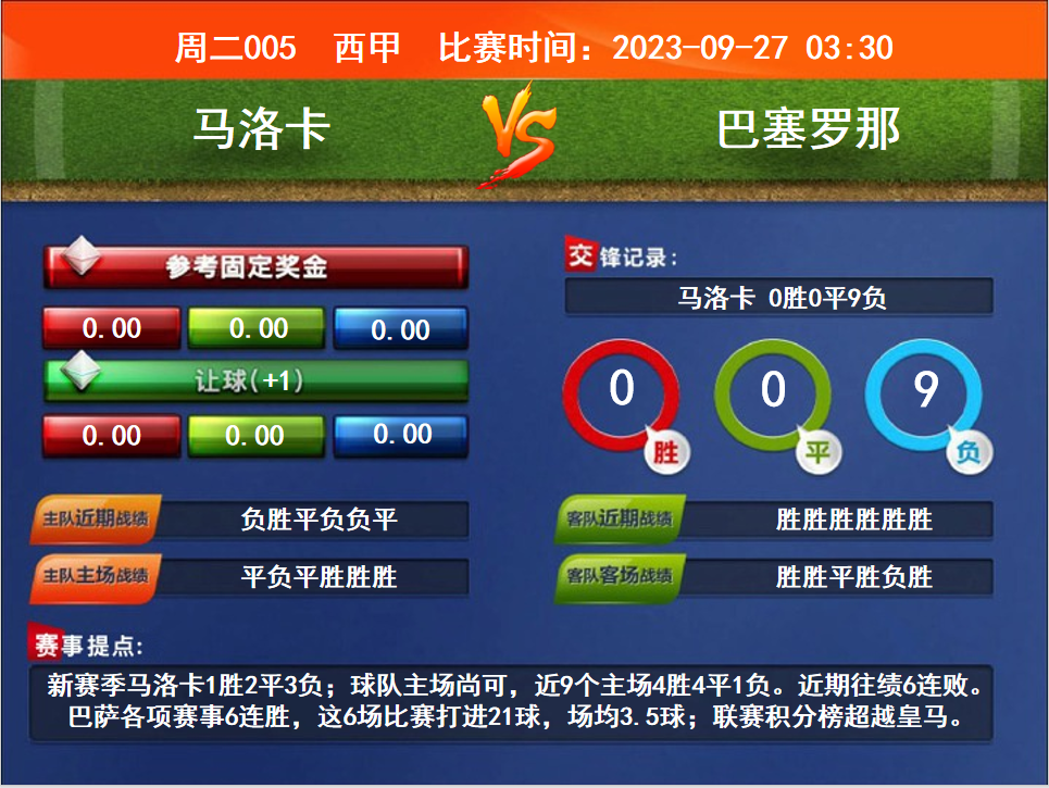 比賽時間:2023-09-27 03:30賽事提點:新賽季馬洛卡1勝2平3負;球隊主場尚可,近9個主場4勝4平1負。近期往績6連敗。巴薩各項賽事6連勝,這6場比賽打進21球,場均3.5球;聯(lián)賽積分榜超越皇馬。