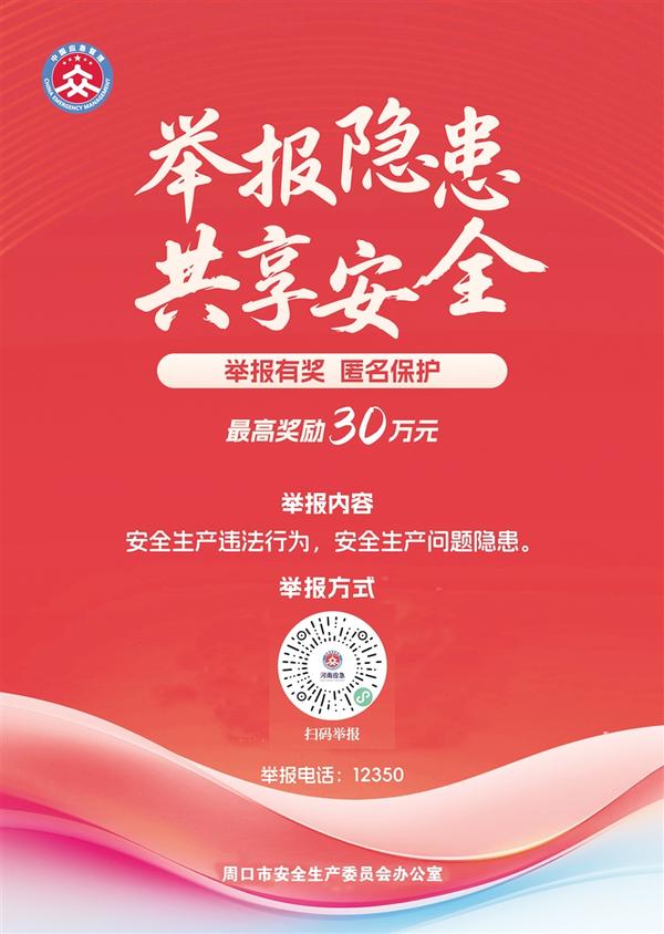 周口市安全生產(chǎn)委員會(huì)辦公室以舉報(bào)電話、掃碼舉報(bào)等方式,受理群眾舉報(bào)安全生產(chǎn)非法違法行為線索。一經(jīng)查實(shí),我們將依據(jù)《河南省安全生產(chǎn)領(lǐng)域舉報(bào)獎(jiǎng)勵(lì)實(shí)施辦法》相關(guān)規(guī)定,對(duì)舉報(bào)人予以獎(jiǎng)勵(lì),最高獎(jiǎng)勵(lì)金額30萬(wàn)元。我們將對(duì)舉報(bào)人個(gè)人信息進(jìn)行嚴(yán)格保密,依法保護(hù)舉報(bào)人的合法權(quán)益。