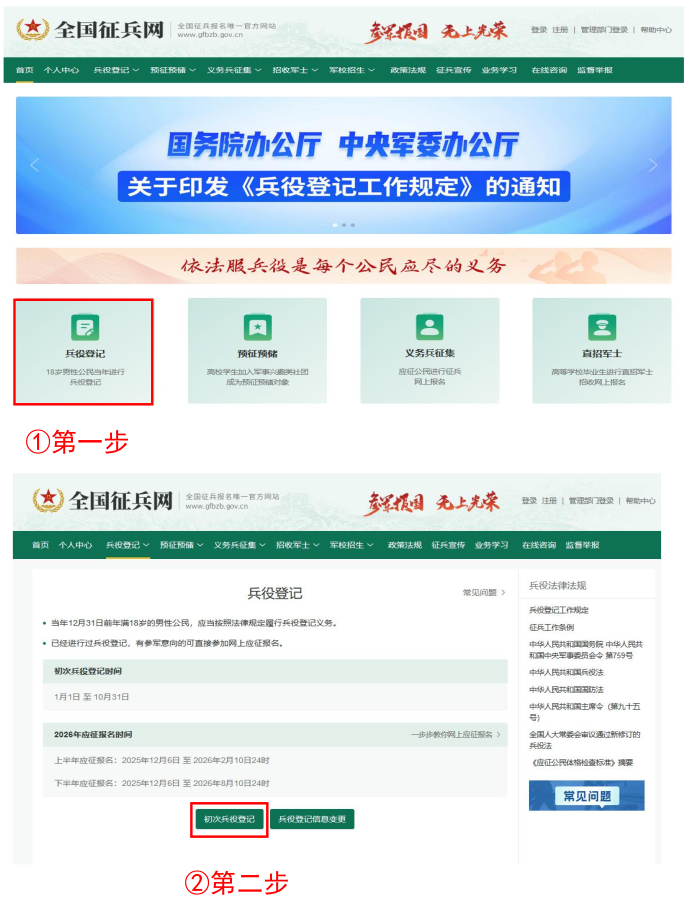 《中華人民共和國(guó)兵役法》規(guī)定,“國(guó)家實(shí)行兵役登記制度。兵役登記包括初次兵役登記和預(yù)備役登記。每年十二月三十一日以前年滿十八周歲的男性公民,都應(yīng)當(dāng)按照兵役機(jī)關(guān)的安排在當(dāng)年進(jìn)行初次兵役登記”。參加兵役登記是法律賦予每個(gè)適齡男性公民應(yīng)盡的光榮義務(wù)和神圣責(zé)任,應(yīng)自覺按時(shí)進(jìn)行登記或核對(duì)。