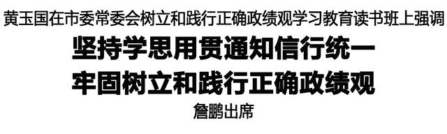 黃玉國(guó)指出,黨的十八大以來,習(xí)近平總書記圍繞樹立和踐行正確政績(jī)觀發(fā)表的一系列重要論述,立意高遠(yuǎn)、內(nèi)涵豐富、思想深刻,為開展樹立和踐行正確政績(jī)觀學(xué)習(xí)教育指明了方向、提供了重要遵循。全市廣大黨員干部要帶著信仰學(xué)、帶著責(zé)任悟,深刻把握“政績(jī)?yōu)檎l而樹”,堅(jiān)守為民造福的根本立場(chǎng);深刻把握“樹什么樣的政績(jī)”,創(chuàng)造經(jīng)得起檢驗(yàn)的過硬實(shí)績(jī);深刻把握“靠什么樹政績(jī)”,錘煉真抓實(shí)干的務(wù)實(shí)作風(fēng),做到學(xué)思用貫通、知信行統(tǒng)一。