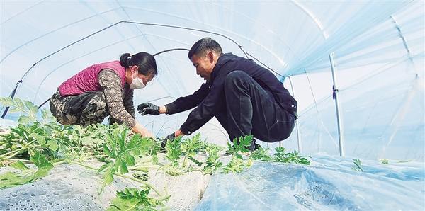 3月15日,在扶溝縣江村鎮(zhèn)江北村現(xiàn)代農(nóng)業(yè)產(chǎn)業(yè)園的大棚里,農(nóng)戶在管理西瓜苗。該園區(qū)占地500余畝,主要種植麒麟美都西瓜、太陽花水果玉米、優(yōu)質(zhì)菠菜,預(yù)計每畝年綜合收益1.2萬元,輻射帶動周邊200余名群眾在家門口就業(yè)。