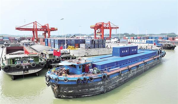 清晨的沙潁河畔,周口港范營(yíng)作業(yè)區(qū)一派繁忙景象。巍然聳立的橋吊如鋼鐵巨臂,精準(zhǔn)地將五顏六色的集裝箱吊裝至貨輪;