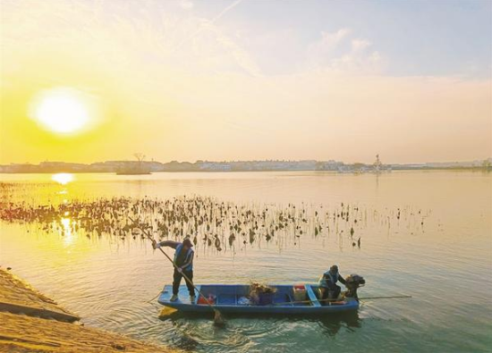 1月12日清晨,淮陽(yáng)龍湖景區(qū)柳湖岸邊,兩位環(huán)衛(wèi)人乘船打撈湖面漂浮物,確保湖區(qū)環(huán)境干凈衛(wèi)生。