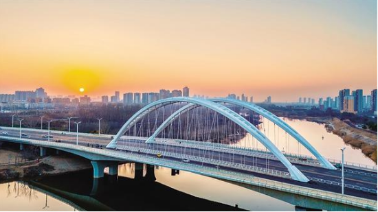 1月14日傍晚,夕陽(yáng)下的中原路大橋巍峨壯觀,沙潁河水面如鏡。