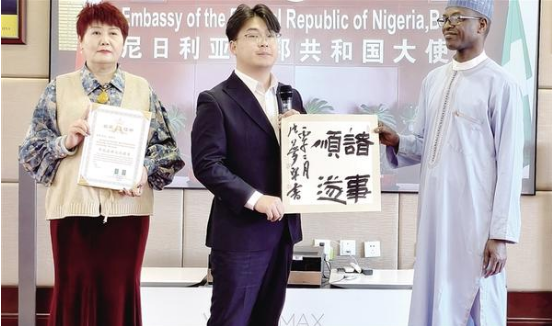 3月11日,周口市青年書(shū)法家張夢(mèng)宇受邀前往尼日利亞聯(lián)邦共和國(guó)駐華大使館,參加中外文化交流活動(dòng),并向使館外交官贈(zèng)送書(shū)法作品,以筆墨為媒,搭建起中尼兩國(guó)文化互鑒、友誼相通的橋梁。