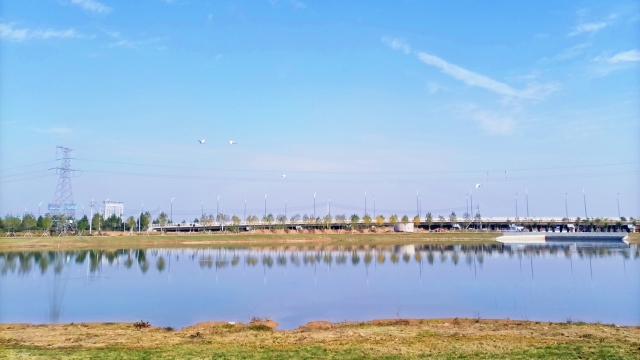 晚秋時節(jié),周口伏羲湖濕地公園風景宜人,舉目望去,波光瀲滟的伏羲湖水面上倒映著藍天、白云、飛鳥,“秋水共長天一色”的絕美畫卷讓人心醉。